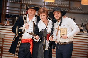 Квест «Завещание Флинта» в лагере: Команда готова к приключениям на острове. Перед стартом все решили собраться для селфи, чтобы запечатлеть свой «пиратский стиль». Шляпы, тельняшки и крюки — все есть для стильного выхода на берег.